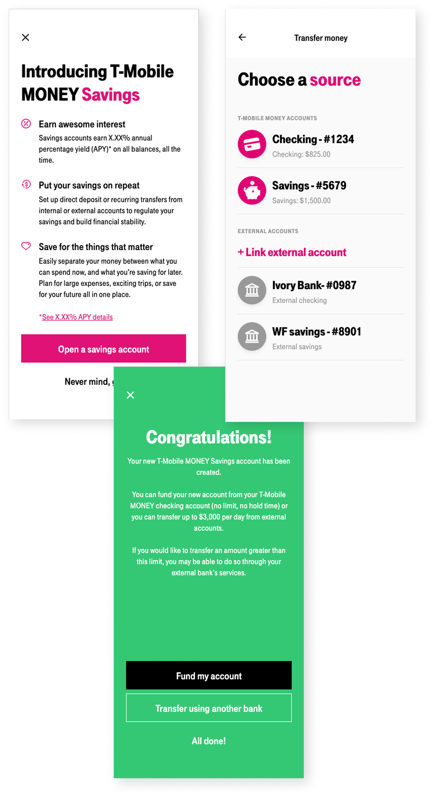 For the first 2 to 3 years of the T-Mobile MONEY application’s existence it’s only product offering was a DDA (Checking account). Eventually I was tasked with leading the launch of a second account type. Shown here are a sample of the final screens from that experience.