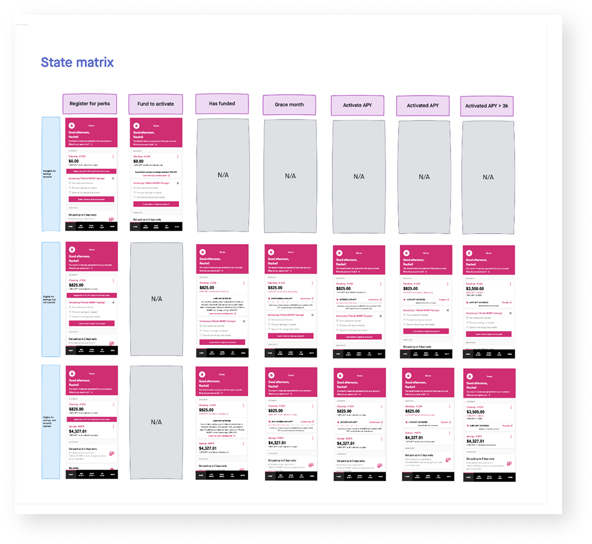 During the later half of the design phase I moved into high-fidelity screen design, mapping out the impacted screens and documenting both the changes needed to existing screens, and net new screens that would be created to support the feature. As part of this effort, I also created a state matrix to track each scenario that a user's dashboard could now exist in, relative to both their perks status and types of accounts they had open.